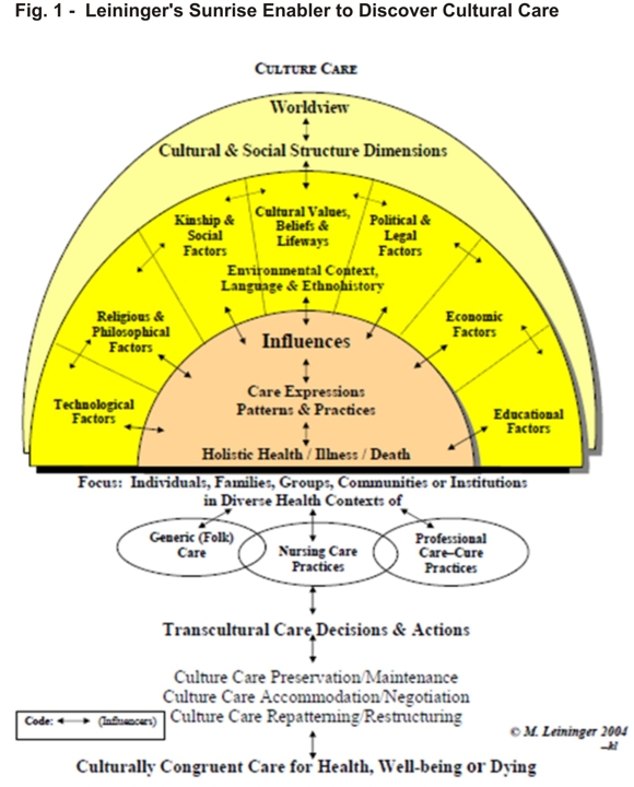 While working on her doctoral thesis at the end of the 1950s, Madeleine Leininger described transcultural nursing as being a specific area of nursing practice. The transcultural health model was presented in the 1970s, but it was only in 1984 that the globally disseminated Sunrise model was published(15). In Brazil, Leininger’s theory became a reference which was used with increasing frequency by the end of the 1980s. Its objective is to provide culturally congruent nursing care for individuals of various cultures. For Leininger, cultural care is concerned with the values, beliefs and expressions that help, support or qualify the individual or group to maintain their well-being and to improve their quality of life(16).