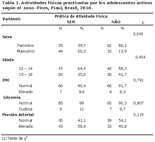 Referentes a la práctica de actividad física, se observó que 49,7% fueron clasificados como inactivos físicamente. Se destaca, aun, que entre los inactivos, 86,1% eran del sexo femenino (p=0,000), 58,3% tenían edad entre 12 e 14 años, 8,3% tenían IMC elevado, 9,7% presentaban glicemia dudosa e 45,8% tenían niveles de presión elevados.