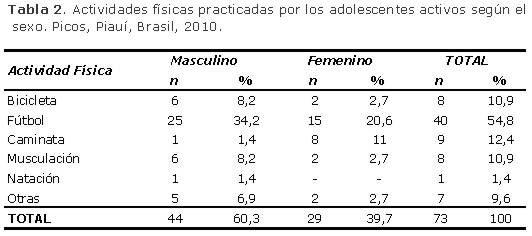 En escuelas de la ciudad de Teresina-PI fueron evaluados 383 estudiantes (190 muchachos y 193 muchachas). Entre los muchachos, 21,5% eran sedentarios; 24,2% eran insuficientemente activos; 2,6% eran obesos y; 8,4% con sobrepeso. Entre las muchachas, 32,1% eran sedentarias; 9,3% eran insuficientemente activas; 1,5% eran obesas y; 13,9% con sobrepeso(20).
