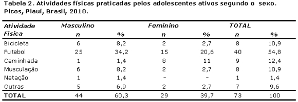Em escolas da cidade de Teresina-PI foram avaliados 383 estudantes (190 rapazes e 193 moças). Entre os rapazes, 21,5% eram sedentários; 24,2% eram insuficientemente ativos; 2,6% eram obesos e; 8,4% com sobrepeso. Entre as moças, 32,1% eram sedentárias; 9,3% eram insuficientemente ativas; 1,5% eram obesas e; 13,9% com sobrepeso(20).
