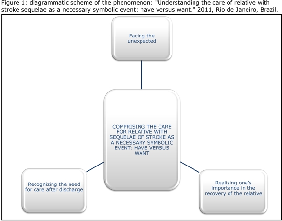 During the review process related to causal conditions, there emerged the phenomenon "Comprising the care for relatives with sequelae of stroke as a necessary symbolic event: have versus want," anchored by categories: "Facing the unexpected", "Recognizing the need for care after discharge" and "Realizing one`s importance in the recovery of the relative.”