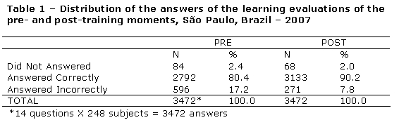Regarding the learning evaluation, table 1 shows that, if compared the moments before and after training, there was a reduction of the number of blank and incorrect answers in the post-training tests, and a rise of correct answers.
