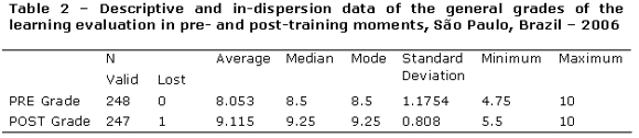 On table 2 , we observe the descriptive and in-dispersion statistical values referred to the general grades of learning evaluation in the pre- and post-training moments.