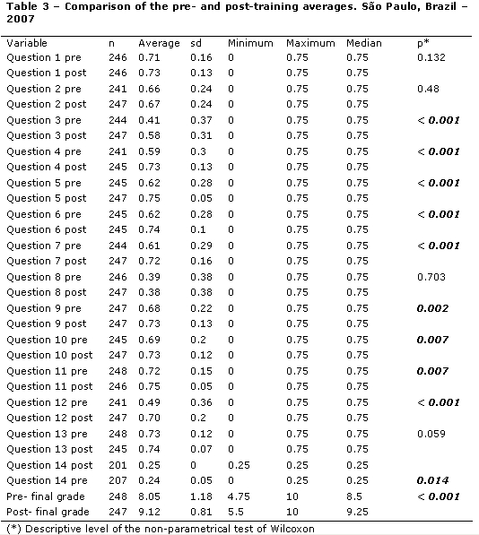 We observed that there was a significant statistical difference from the pre- to the post-training grades in all questions, except the issues 1, 2, 8 and 13, in which the test did not show significant difference. Considering the professional category and the average grades in the pre- and post-training results, there was no significant change in the average grades through the application of the non-parametrical test of Kruskal-Wallis, p=0,244, and in the post-training moments, the non-parametrical test of Kruskal-Wallis showed p=0,104.