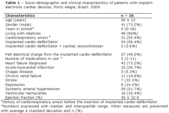A total of 56 patients fitted with electronic cardiac devices were included in this study. Of these, 54 (or 96.4%) had an IDC, and two (3.6%) had an IDC combined with a CR. The average age was 58±13 years. There was a large number of male patients, and 50% of the sample was composed of people with up to five years of schooling. Cardiorespiratory arrest (CRA) was reported in 55.4% of the cases, and 27 patients (or 48.2%) felt the electrical discharge from the IDC. The general characteristics of the studied patients are as shown in Table 1.