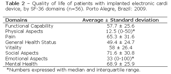 The majority of the studies into the quality of life of patients with implanted cardiac devices present the application of the SF-36 form prior to the implant, and with a second interview three to twelve months after the procedure. In this study, the data collection was performed only once, in an interview at the clinic with patients who were fitted with these devices, rather than when the procedure happened, which does not permit an analytical statistical comparison.