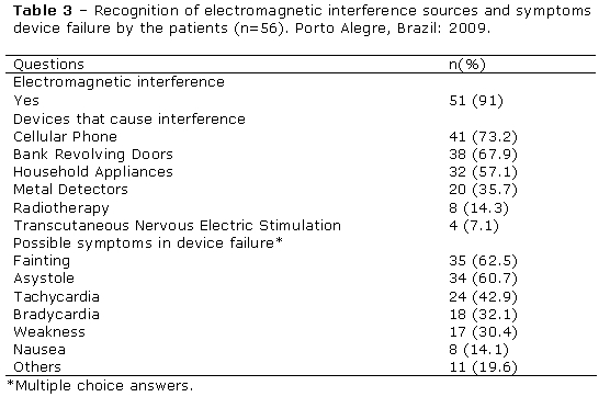 Out of the 56 patients, 51 (91%) believed that their device could suffer from some sort of electromagnetic interference, especially from the use of cellular phones and revolving doors in banks. In the event of device failure due to battery failure, for example, 62.5% of the patients answered that they could faint and 60.7% believed that their hearts would cease to beat. See Table 3.