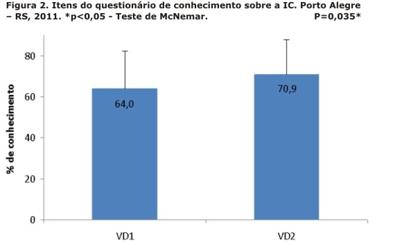 As variáveis categóricas foram descritas com números absolutos (n) e relativos (%). O escore do conhecimento nas VDs foi comparado pelo teste t pareado e pelo teste de McNemar. Para verificar associação entre o delta do percentual de conhecimento médio adquirido e o tempo de IC e escolaridade (anos de estudo), foi realizada a correlação de Spearman's (P <0,05). O Programa Estatístico SPPS v.14 foi utilizado para estas análises.