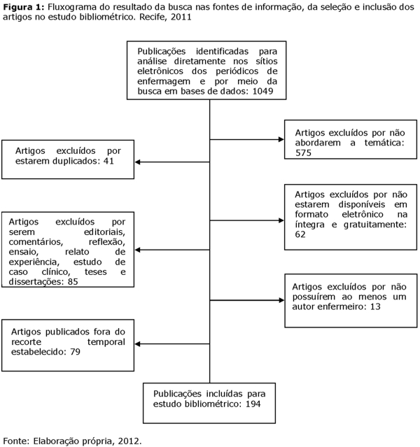 A busca pelos artigos foi efetuada diretamente em websites de destacados periódicos de enfermagem, a saber: Acta Paulista de Enfermagem, Revista da Escola de Enfermagem da USP, Revista Latino Americana de Enfermagem, Revista Texto e Contexto Enfermagem, Revista Brasileira de Enfermagem, Revista Gaúcha de Enfermagem, Revista da Escola Ana Nery, Revista Baiana de Enfermagem, Online Brazilian Journal of Nursing (OBJN), Revista de Enfermagem da UERJ, Revista Mineira de Enfermagem (REME), Revista Eletrônica de Enfermagem, Nursing (São Paulo), Cogitare Enfermagem, Revista de Enfermagem UFPE Online (REUOL) e Revista de Investigação em Enfermagem.