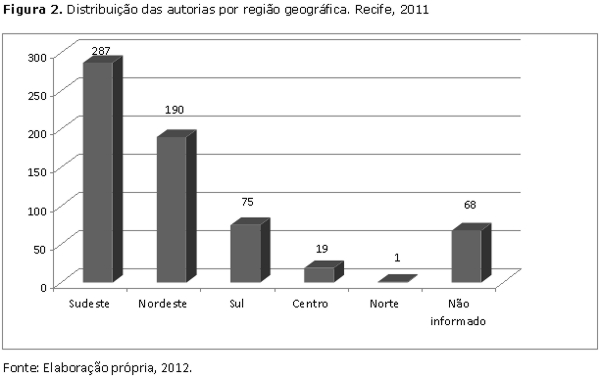 A Universidade de São Paulo destacou-se com 20,47% (n=131) dentre as autorias do Sudeste, seguida pela Universidade Federal do Ceará, que obteve a expressiva participação de 119 autorias, equivalente a 18,59% da região Nordeste. Em terceira posição, constou a Universidade do Estado do Rio de Janeiro com 73 (11,71%) autorias publicadas.