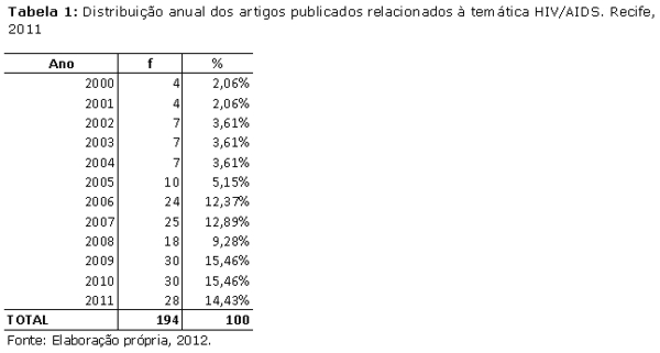 Diante do exposto, teve-se por objetivo analisar a produção científica brasileira de enfermagem sobre HIV/AIDS publicada em periódicos no período de 2000 a 2011.