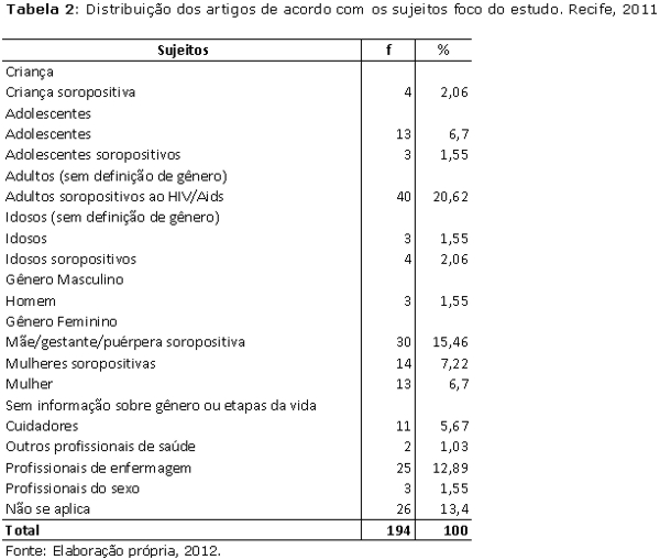 Quanto aos sujeitos ou população investigados nos estudos, a maioria (n=40), equivalente a 20,62%, concentrou-se em adultos soropositivos ao HIV, assintomáticos ou com AIDS, sem, no entanto, fazer distinção de gênero. Houve 26 (13,40%) artigos de revisão bibliográfica ou documental, cujo material empírico foi coletado em bases de dados ou ambientes informatizados. Por não especificarem uma população, foram classificados na categoria “não se aplica”. Apenas três estudos (1,55%) focalizavam os profissionais do sexo, fato a ser mencionado, haja vista as normatizações sociais relacionadas a estes trabalhadores (Tabela 2).