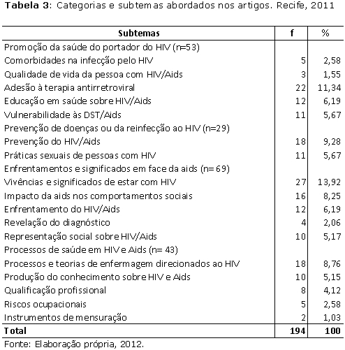 Os demais resultados dos principais subtemas aqui encontrados apontam tendências e dão subsídios para o reconhecimento da urgência de realização de novas pesquisas voltadas às lacunas existentes na literatura que precisam ser mais investigadas com vistas a se encontrar estratégias de prevenção, enfrentamento, assistência e formação de recursos humanos na área de enfermagem mais eficazes contra o HIV.