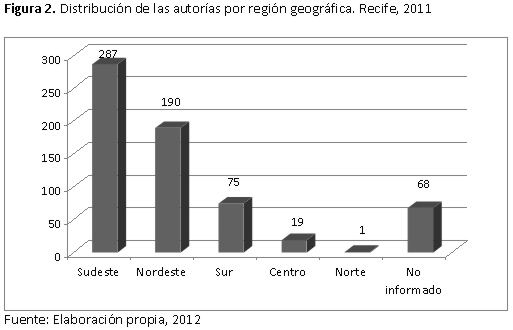 En la tangente de la ubicación geográfica, se verifico un predominio de 287 (44,84%) autorías de investigaciones realizadas en la región Sudeste, seguida por la región Nordeste con 190 (29,68%). Se observó que 68 (10,63%) autorías no informaron la institución a que estaban vinculados (Figura 2).