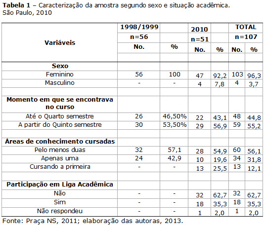 Os dados de caracterização da amostra obtidos com 51 alunos no ano de 2010 e 56 nos anos de 1998 e 1999 estão apresentados na Tabela 1, a qual descreve o sexo e a situação acadêmica dos respondentes no momento do preenchimento do questionário.