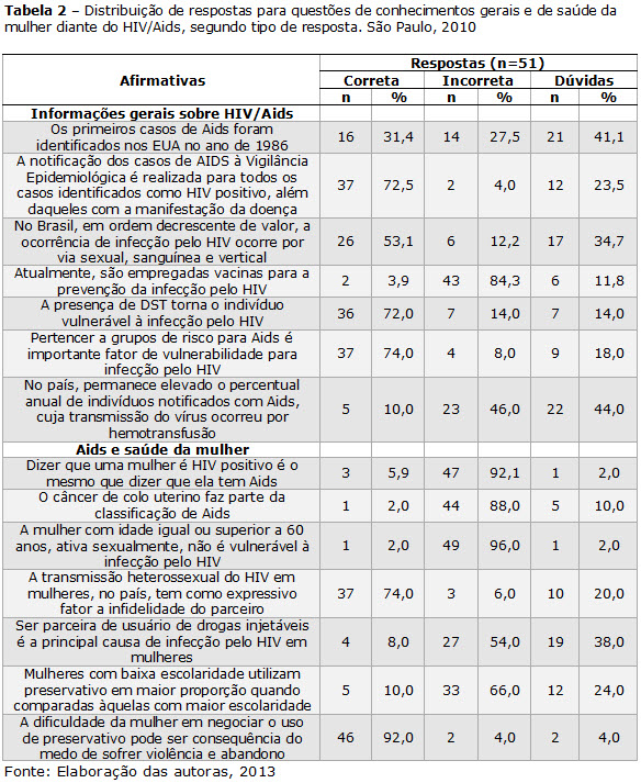 Do exposto, acredita-se, também, que novas estratégias de ensino-aprendizagem devam ser estabelecidas pelos cursos de graduação, de modo a motivar os alunos para o estudo da Aids na saúde da mulher, contribuindo, assim, para a redução de lacunas de informações/conhecimentos sobre o tema.