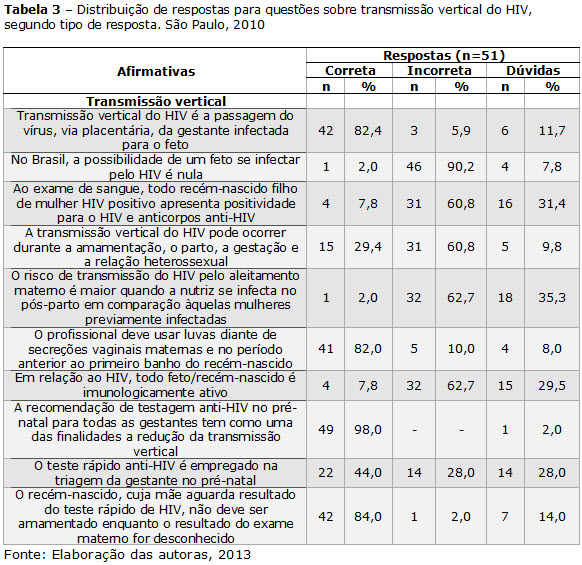 Na Tabela 3, verifica-se maior percentual de respostas corretas para as afirmativas relacionadas à via de transmissão vertical do HIV (n=42; 82,4%); ao emprego de precauções-padrão ao realizar procedimentos junto à mãe e ao recém-nascido (n=41; 82%); à finalidade da testagem anti-HIV no pré-natal (n=49; 98%) e; à não amamentação na ausência de testagem anti-HIV materna (n=42; 84%).