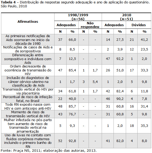 Na Tabela 4, verifica-se que, em 2010, houve uma retração do número de respostas adequadas para a maioria das afirmativas, em comparação ao ano de 1998/99. É importante ressaltar o elevado percentual de “dúvidas” em relação ao ano das primeiras notificações de casos de Aids no Brasil, (n=21; 41,2%); notificação universal de indivíduos com HIV e Aids (n=12; 23,5%); ordem decrescente de ocorrência de infecção pelo HIV, no país (n=17; 33,3%); afirmação de que todo recém-nascido exposto ao HIV tem o vírus da Aids e; teste anti-HIV positivo (n=16; 31,4%). Também, constatou-se dúvidas por parcela significativa de estudantes na associação do aumento do risco de transmissão vertical pela via da amamentação com a ocorrência de infecção materna no período pós-parto (n=18; 35,4%).