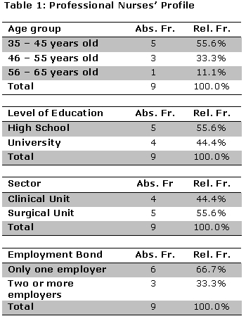 The study’s participants were 9 professional nurses, among whom 6 were technical nurses and 3 were graduate nurses. The characterization of the study population is shown in Table 1.
