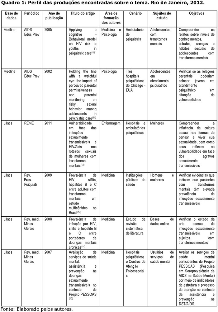 Das referências consultadas na íntegra, observou-se o predomínio de publicações em revistas médicas, sendo quatro nacionais(13-14-15) e duas internacionais(10-11). Apenas uma publicação(12) é procedente da área de enfermagem, o que denota a necessidade de novos estudos sobre a vulnerabilidade para o HIV/AIDS em pessoas com transtornos mentais principalmente por profissionais de enfermagem, integrantes de equipes de saúde mental.