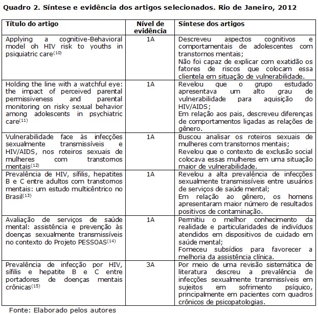 Na quinta etapa, por sua vez, foi realizada a análise crítica dos trabalhos selecionados(8), comparando-se os conhecimentos teóricos, a identificação de conclusões e implicações resultantes da revisão integrativa, sendo possível identificar a condução das situações que favorecem a aquisição do HIV/AIDS entre pacientes com transtornos mentais, incluindo-se uma possível vulnerabilidade deste grupo.