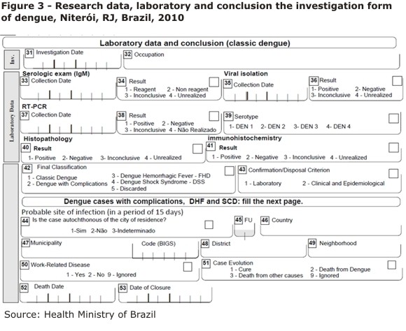Figure 3. Research (fields 31 and 32) - this corresponds to data such as date of investigation and occupation. Laboratory data (fields 33 to 41) - this contains the results that enable the confirmation of suspected cases, as well as providing data for epidemiological studies. The information corresponds to data such as date of collection and results of serologic tests (IgM), virus isolation, RT-PCR, serotype, histopathology and immunohistochemical analysis. Conclusion (fields 42 to 53) - this contains information about the confirmation and closure of the case, and it enables epidemiological studies to determine the source of outbreaks and epidemics. It corresponds to data as final classification, criterion for confirmation/disposal, suspected infection site, FU, country, county, district and neighborhood, whether it is a work related disease, progression of the case, date of death and date of closing.