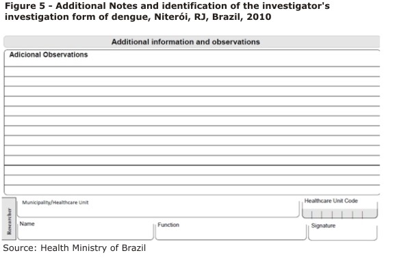 Figure 5. Additional Notes - this area is reserved for additional information considered important for the professional to register.Researcher – this is an area for the identification of the investigator/notifier, containing municipality, health unit and its code, name of the investigator, function and signature.
