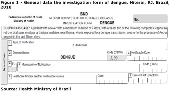 For the analysis of data completeness of the fields of FIN, a checklist was developed by the researchers consisting of three columns: the first field is identified by the corresponding number of dengue FIN, and the second and third are "filled" and "blank” respectively, marked according to the filling in of the form.