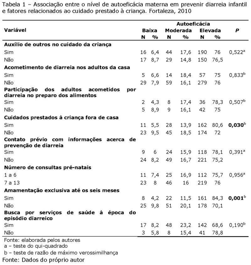 Resultados: Verificou-se associação significante entre os níveis de autoeficácia e as variáveis: cuidados prestados à criança fora de casa (p=0,03), amamentação exclusiva até os seis meses (p=0,001), existência anterior de algum episódio diarreico (p=0,001), o fato de a criança possuir alguma patologia (p=0,020), internação da criança no primeiro mês de vida (p=0,038) e vacinação contra o rotavírus (p=0,003).