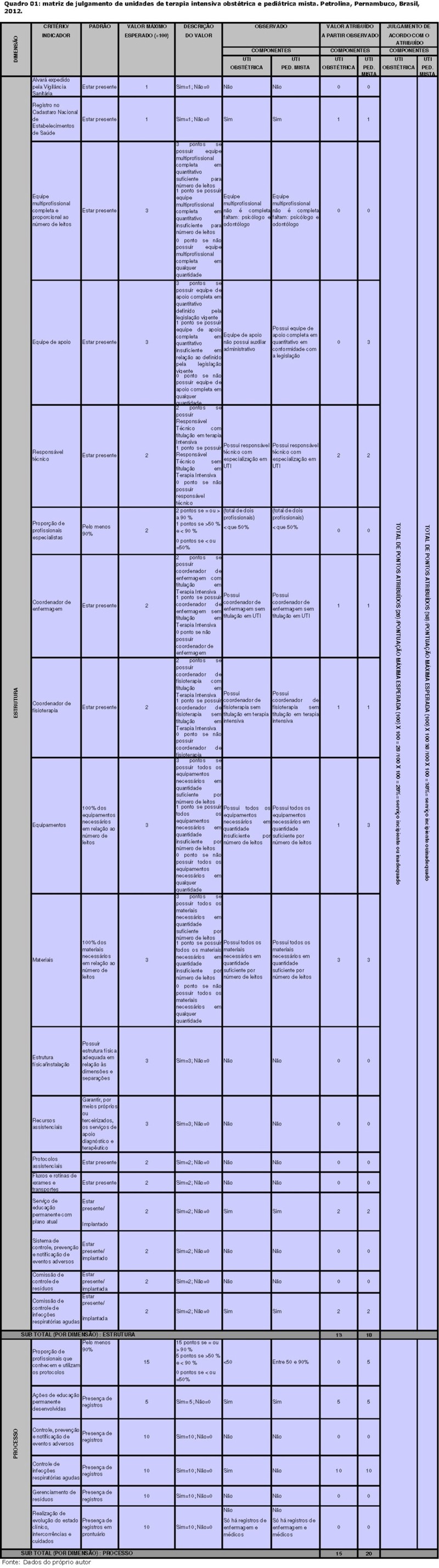 Em relação à dimensão estrutura, a UTI obstétrica obteve 13 pontos (32,5%) e a UTI Pediátrica mista, 18 pontos (45%). Na dimensão processo, à UTI obstétrica foram atribuídos 15 pontos (25%) e à UTI pediátrica 20 (33,3%). Quanto à estrutura, dentre os critérios avaliados, destacaram-se a inexistência do alvará de funcionamento, equipes multiprofissionais incompletas (ausência de odontólogo e psicólogo) e de apoio incompletas (no caso da UTI obstétrica), proporção de especialistas em terapia intensiva menor que 50% (sendo identificados apenas dois profissionais intensivistas em cada UTI), coordenadores de enfermagem e fisioterapia sem título de intensivista e insuficiência de equipamentos (no caso da UTI obstétrica). É válido ressaltar que, por se tratarem de áreas específicas da profissão de enfermagem como a obstetrícia e a pediatria, poderiam ser consideradas para os coordenadores de enfermagem, além da especialização em UTI, as especializações em enfermagem obstétrica, que estava sendo cursada pela coordenadora desta, e também enfermagem pediátrica ou neonatal para os profissionais da UTI pediátrica mista, titulação que não compreendia a coordenação dessa unidade.