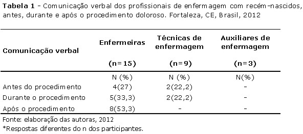 Ao avaliar a comunicação verbal dos profissionais de enfermagem antes, durante e após o procedimento doloroso, percebeu-se que as enfermeiras eram as que mais se comunicavam verbalmente com os RN, conforme mostra a Tabela 1.