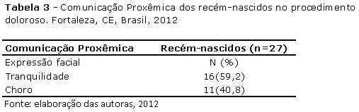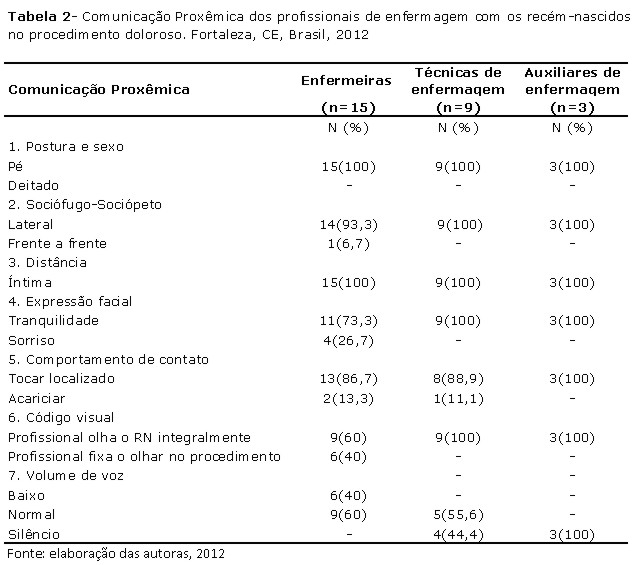 Resultados: os dados foram organizados em duas temáticas: comunicação verbal do profissional de enfermagem antes, durante e após o procedimento doloroso e comunicação não verbal durante o procedimento doloroso à luz da Teoria Proxêmica. Os recém-nascidos, por meio da comunicação não verbal, expressaram face de tranquilidade e choro aos profissionais. Contudo, estes mantiveram diálogo verbal diante da dor daqueles.