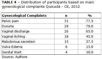 The most frequent gynecological complaints made by the research participants were pelvic pain, dysuria and vaginal discharge. A similar study with 339 pregnant women pointed to a 51.6% occurrence rate of vaginal discharge, confirming it as one of the most common gynecological complaints(14).