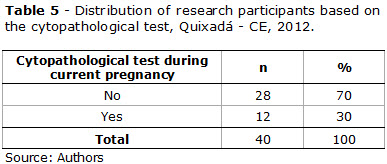 The most frequent gynecological complaints the participants mentioned were pelvic pain (n=31; 77.5%), dysuria (n=28; 70%) and vaginal discharge (n=26; 65%). In addition, four women (10%) had genital warts. In addition, most of the women (n=28; 70%) did not undergo a cyptopathological test during the prenatal exam, as shown in Table 5.