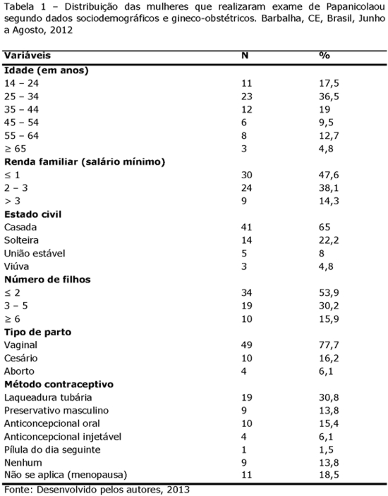 A amostra foi composta pelo universo das mulheres atendidas no referido centro e no período estipulado para a coleta de dados, totalizando 63 mulheres que atenderam ao seguinte critério de inclusão: ter ido a busca de consulta ginecológica no Centro de Saúde Materno-Infantil. Os critérios de exclusão adotados foram: ser histerectomizada e não ter aceitado participar do estudo.