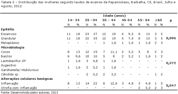 Quanto às alterações celulares benignas, evidenciou-se que a inflamação, isoladamente, foi a mais prevalente alteração celular observada, presente em 58,6% dos laudos. A atrofia com inflamação em mulheres acima de 55 anos representou 6,4% dos resultados. Ressalta-se que lesão de alto grau, carcinoma epidermóide invasor, em que não se pôde excluir microinvasão, acometeu uma mulher com idade entre 55 e 64 anos, representando 1,6% entre a população estudada (Tabela 2).