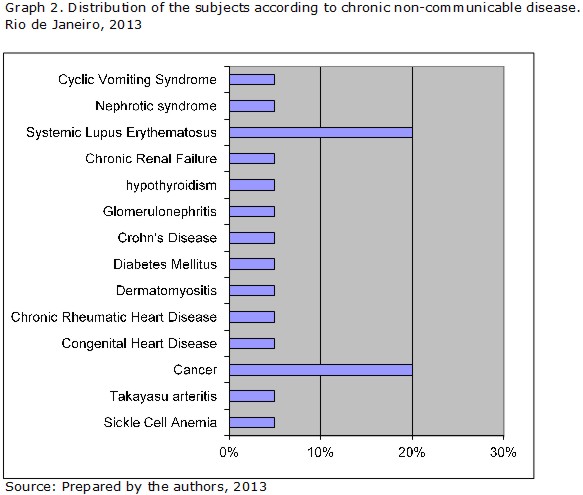 Graph 2 shows the distribution of subjects by chronic non-communicable disease. There is a high incidence of cancer patients suffering from systemic lupus erythematosus.