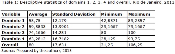 Observing Table 1, we can conclude that domain 3 showed the highest average score (74.1666), maximum (100) and minimum (50). Domain 1, had the lowest average score (58.75) and the lowest standard deviation (12,179).