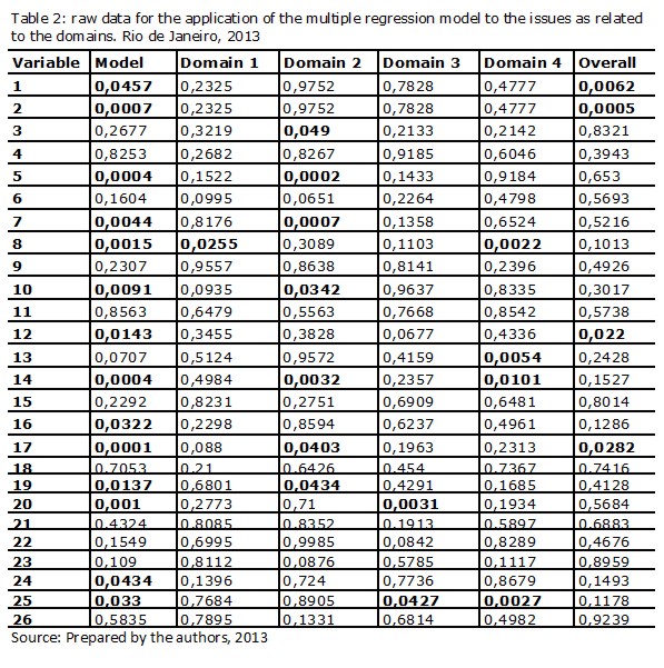 After analysis of Table 2, we note that at least one of the domains explains issues 1, 2, 5, 7, 8, 10, 12, 14, 17, 19, 20 and 25. The ‘overall’ domain with p- value (0.0457) and (0.0007) explains, respectively, the variation of the responses to questions 1 and 2.