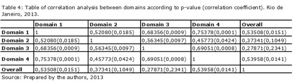 Analyzing Table 4, we note that all domains have a p-value of lower than 0.05, which shows there is a strong indication that the correlation coefficient is different from 0 and thus the variables may be correlated. This is except for domains 2 and 3 in comparison to the overall domain (p-values of 0.1049 and 0.2341). In fact, most of the variables has a coefficient of correlation greater than 0; the highest between the domains 1 and 4 have a correlation coefficient of 0.75378.