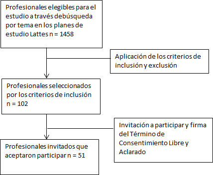 Estudio metodológico con abordaje cuantitativo, realizado de septiembre a noviembre de 2012. Para identificar a los profesionales de la salud de Brasil que pudiesen actuar como jueces del instrumento, fue realizada una búsqueda en las plataforma Lattes del Consejo Nacional de Desarrollo Científico y Tecnológico (CNPq), utilizando una búsqueda avanzada por asunto, seguida de la aplicación de los criterios de inclusión y exclusión y la invitación a los potenciales participantes (Figura 1).