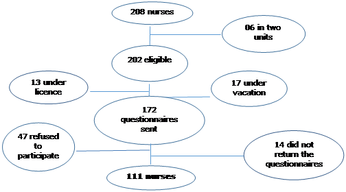 This is a census, descriptive study, performed with 10 nurses in neonatal units of the public health network system of the municipality of Rio de Janeiro, who take care of the NB. The criteria for exclusion were those professionals who were away on vacation, medical leave, and/or premium leave during the period of data collection. The nurses were recruited on the basis of their monthly work schedule in each unit, and were invited to participate in the research after the explanation of the goals of the study. A numbered questionnaire was handed to the participant and returned to the researcher after completion and, in the absence of the investigator, placed in a sealed envelope in a box located in the unit. Those who worked simultaneously in more than one researched unit were excluded from one of them. From the total of 202 eligible professionals, 111 participated in this study (Image 1).