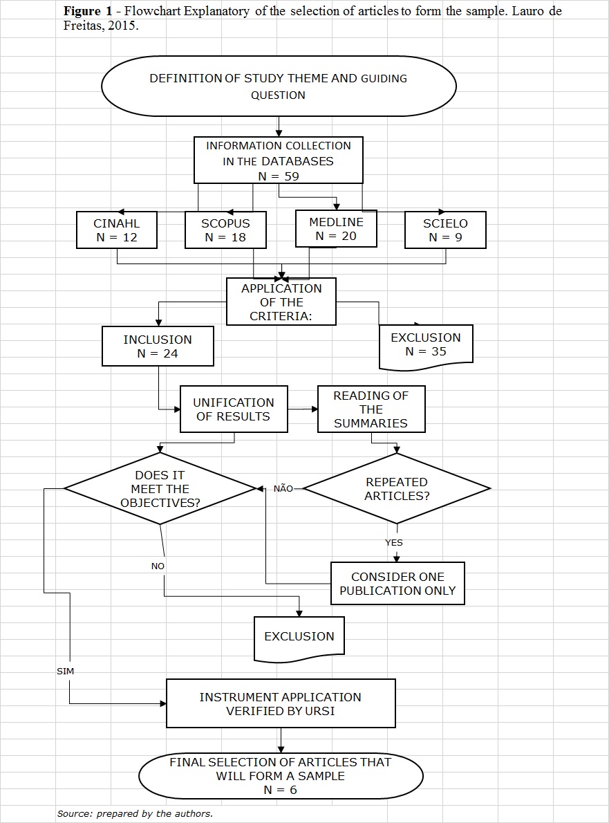 The survey of the databases generated 59 articles related to the study. After application of the previously defined exclusion and inclusion criteria and analysis of the titles related to the theme, an initial sample was obtained with 24 articles whose summaries were read and analyzed according to the research objectives, resulting in a final sample of six articles.