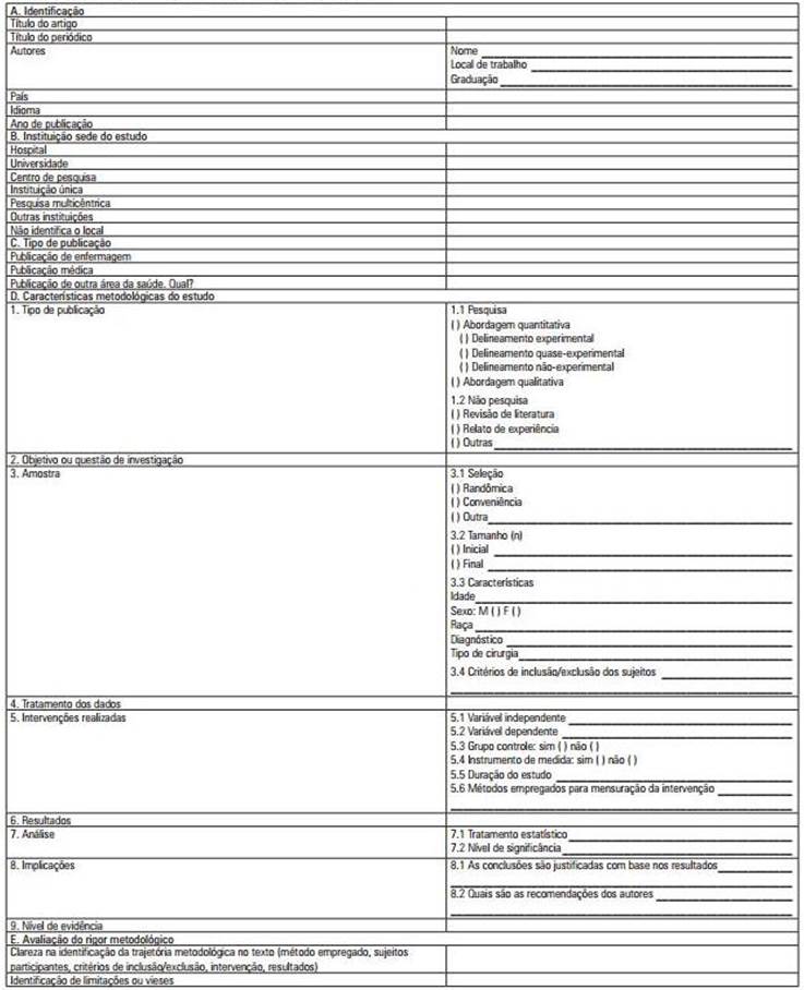Souza, Silva, and Carvalho (2010) recommend the use of the instrument validated by URSI(13), which includes the following: name of research, type of publication, methodological detailing, sample detailing, studied intervention, findings, recommendations, and conclusions. This instrument is provided in Annex A.