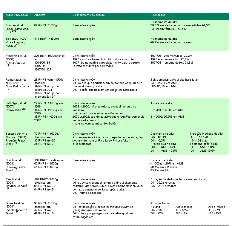 Comparando as diferenças das taxas de aleitamento entre RNBP com os RNMBP, evidencia-se uma maior freqüência de AM entre os bebês prematuros de maior peso ao nascer (20). Em contrapartida, estudo realizado com 29.940 recém-nascidos dos Estados Unidos admitidos em UTI Neonatal revelou que os bebês PT obtiveram índices maiores de AM quando comparados aos bebês a termo que não receberam o cuidado intensivo (35), já que esse ambiente possui uma forte característica de promover suporte ao aleitamento. Esse estudo vem corroborar os achados da presente revisão que encontrou seis estudos com intervenções, demonstrando resultados satisfatórios e significativos para a promoção, proteção e apoio ao AM.