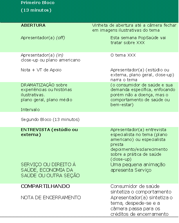 A oralidade e a resiliência presentes na cultura brasileira como instrumentos para despertar a consciência de saúde e bem-estar no indivíduos. O conhecimento científico em saúde é a matéria-prima do programa, mas evitando um discurso retórico de “verdade'', como fato consumado. Cabe ressaltar ainda que somado ao conhecimento científico, o bom senso das práticas de saúde oriundo das medicinas de matriz popular, africana ou indígena, também será objeto do programa em contra-posição a aspectos do senso comum que perpetuam hábitos irrefletidos ou mesmo danosos. (e) Linguagem audiovisual: de modo geral será utilizado o plano médio ou próximo em ângulo plano. O programa se estrutura em 02 blocos com 03 seqüências cada um, conforme descrito a seguir. Os movimentos de câmera seguem os exigidos para os planos médio ou próximo, a aprtir de uma visão objetiva. Primeiro bloco · Factual (narração in/off)= acompanhada por imagens de arquivos e externas; espaço para exposição de idéias fundamentais do tema básico · VT de apoio = perspectiva do tema · Dramatização = problematiza uma situação para reflexão/apoio à entrevista Segundo bloco · Entrevista com especialistas (estúdio ou externa) = apresenta o discurso acdêmico-científico que aprofunda e enriquece o tema · Cultura da saúde= manifestações de práticas culturais saudáveis e seguras · Comportamento saudável= apresenta o consumidor (usuário SUS) de saúde/bem-estar e seu estilo de vida saudável · Economia da saúde= apresenta o valor do custo da doença/tratamento e o valor do insvetimento na prevenção Outras Seções · direito à saúde= cartela com informações práticas sobre os direitos do consumidor de saúde/usuário SUS, sites, locais de serviço · controle social da saúde= apresenta as boas práticas de acompanhamento dos serviços de saúde pela sociedade organizada · ciclo vital= apresenta as implicações do tema para os grupos etários · no consultório= apresenta as informações importantes sobre o tema que o consumidor de saúde/usuário do SUS deve dizer ao profissional de saúde (f) Temas centrais de cada episódio sobre saúde e bem-estar PopSaúde deverá ser percebido como informação e não como ruído. PopSaúde deverá ajudar a pessoa a ver as ações de saúde como algo que faz sentido no seu universo